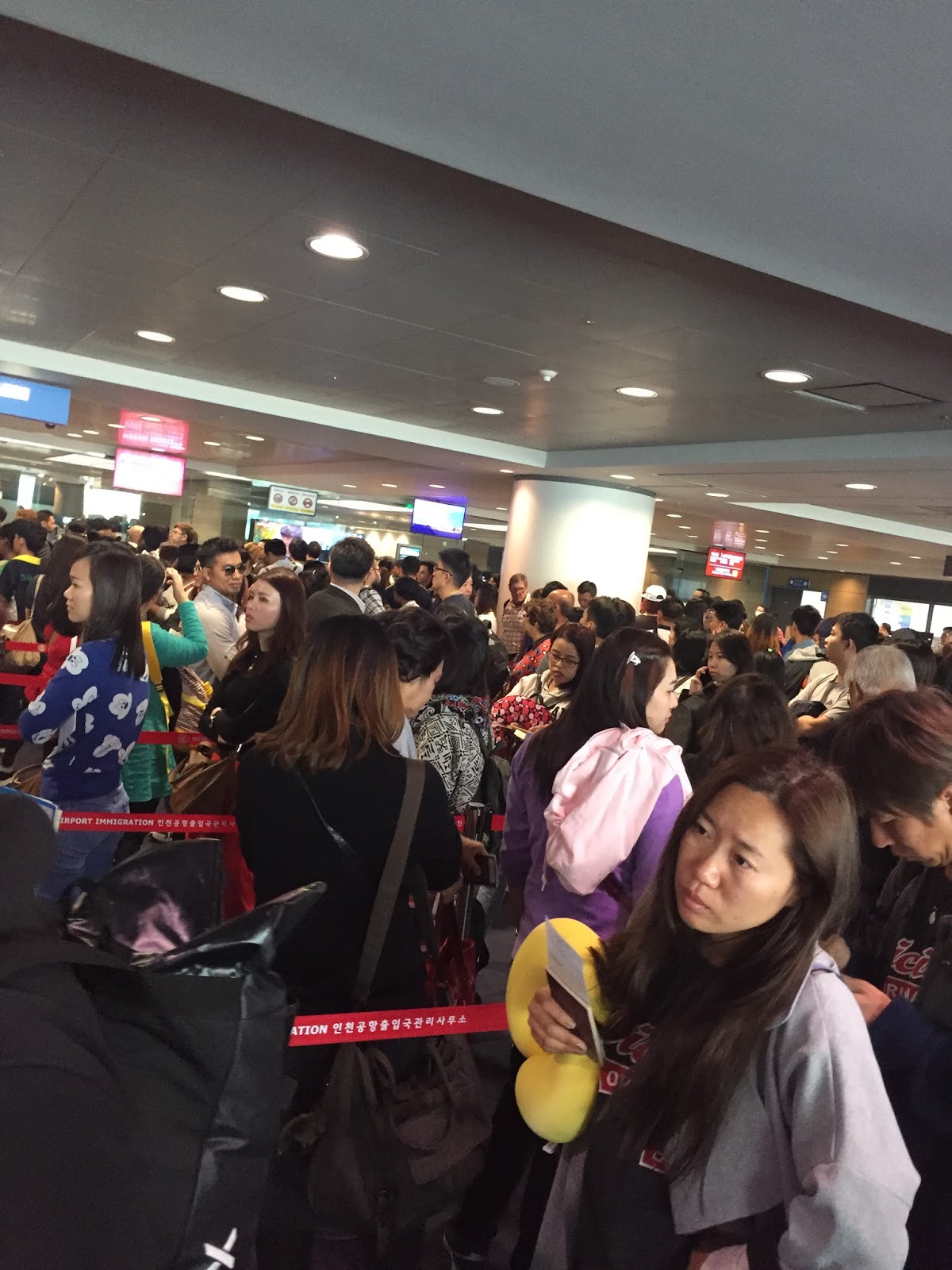 在飞机上折腾了6个多小时,终于在早上8点多到达韩国了~~~哟呼~~~~熟悉的机场啊~~~~~我的韩国朋友原本说9点半在入镜门口等我,然后跟我去吃个早餐的,结果!!!!!当我走到入镜柜台的时候,我整个人就惊呆了@@